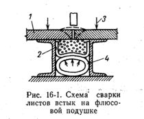 Схематически устройство флюсовой подушки показано на рис. 16-1. Листы 1 укладываются на стеллаж так, чтобы стык располагался над флюсовой подушкой, представляющей гибкий короб 2, закрепленный между балками стенда и заполненный флюсом. Прижимами 3 листы плотно прижимаются к стенду, подачей сжатого воздуха в шланг 4 создается равномерное поджатие флюса по всей длине стыка.
