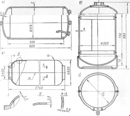 а — тормозной резервуар грузового автомобиля; 6 — ацетиленовый баллон; в — сосуд высокого давления; г — шар-баллон из титанового сплава