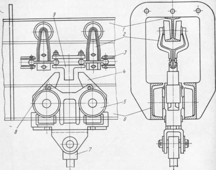 Для обеспечения нормальной работы поточных и автоматических линий и равномерной их загрузки подвесные толкающие конвейеры работают непрерывно. Несущие подвески, проходя мимо рабочего места и не получая сигнала об остановке, отправляются на склад, где автоматически останавливаются при упоре друг в друга. Как только путь окажется свободным, происходит захватывание очередного упора непрерывно движущегося тягового элемента и подвеска снова отправляется в путь. В том месте, где изделие надо опустить к рабочему месту 5, грузовой путь делают