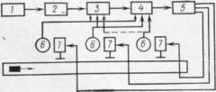 Рис. 13.13. Схема централизованного управления адресования грузов: 1 — пульт управления; 2 — кодирующая схема; 3 — запоминающее устройство; 4 — орган сравнения; 5 — дешифратор; 6 — датчики положения груза; 7 — исполнительные механизмы