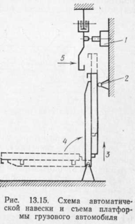 грузового автомобиля (рис. 13.15) осуществляется следующим образом. При движении конвейера подвеска нажимает на концевой выключатель /, останавливающий подвеску и включающий механизм поворота 4 рамы кантователя с грузовой платформой. Окончание поворота фиксируется концевым выключателем 2 с одновременным включением механизма, который поднимает 3 выступ платформы выше уровня упора подвески. Затем подвеску отклоняют 5 так, чтобы ее упор оказался под выступом платформы, после чего все действия производят в обратном порядке.