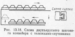Иногда используют тележки-спутники, как на двухъярусном конвейере автоматической линии сборки и сварки пола кабины автомобиля ЗИЛ (рис. 13.18). Тележки движутся в одном напоав-лении и передаются с одно-