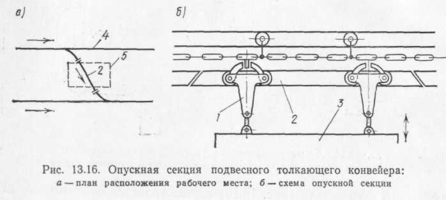 разъемным (рис. 13.16,6) и отрезок пути 2 (опускную секцию) вместе с тележками 1 и траверсой 3 с подвешенным изделием опускают, а после проведения работ поднимают в вертикальных направляющих с помощью подъемного механизма. Как показано на рис. 13.16,а, опускную секцию 2 располагают вне магистральной линии 4, с тем чтобы непрерывность работы конвейера не нарушалась.