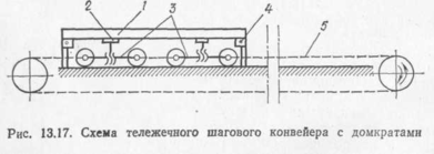 Для передачи деталей или узлов с одлой позиции на другую в поточной, а еще чаще в автоматической линии широко используют шаговые конвейеры. В конвейерах этого типа детали или узлы на размер шага перемещают устройства, совершающие возвратно-поступательное движение (сцеп тележек, штанга или рамка). Движение задается либо гибким тяговым элементом с при-