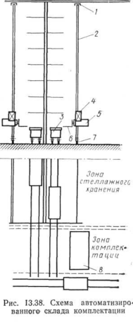 В условиях индивидуального и мелкосерийного производства при большей номенклатуре выпускаемых изделий особое значение приобретает организация промежуточного склада полуфабрикатов. Для механизации и автматизации операций на таких складах целесообразно использовать специализированное оборудование, управляемое с помощью устройств вычислительной техники. Такого рода проект реализуется в производственном объединении «Уралмаш». Склад комплектации должен производить прием,, хранение, учет, комплектацию и своевременную выдачу на сборочные участки всех необходимых для выполнения конкретного заказа: заготовок и комплектующих изделий. Хранение грузов производится в высотных консольных стеллажах. Длинномерные грузы (заготовки профильного проката, трубы) размещаются в специальных кассетах, мелкие детали — в контейнерах. Краны-штабелеры под-