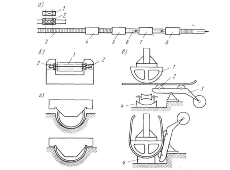 Рис. 13.37. Схема расположения оборудования заготовительного участка производства труб большого диаметра: а — схема линии; б — схема строгального станка; в — схема предварительной формовки; г — схема окончательной формовки корыта