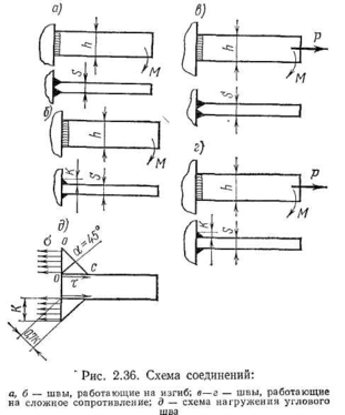 При рассмотрении прочности прикреплений элементов, работающих на изгиб, будем предполагать, что угловые швы имеют форму равнобедренного треугольника. Расчет прочности производится на срез в плоскости, совпадающей с биссектрисой прямого угла и равной по площади βKa, где К — катет шва, а — длина шва.
