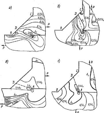 ных сечениях, равных пределу текучести (рис. 2.52, а, 6), и в момент начала разрушения швов (рис. 2.52, в, г). Из рис. 2.52, а, б видно, что/области концентрации напряжений располагаются j\ корня шва (точка А) и по линиям перехода от шва к соединяемым деталям (точка В на рис. 2.52, а и точка С на рис. 2.52, б). При увеличении нагрузки (рис. 2.52, б, г) густота линий равных напряжений уменьшается, что говорит о снижении концентрации напряжений. Важную роль при этом играет направление нагрузки по отношению к плоскости непровара. При одинаковых уровнях средних напряжений нагрузка, перпендикулярная плоскости непровара (рис. 2.52, б), дает большую концентрацию напряжений, чем параллельная плоскости непровара (рис. 2.52, а). Эта закономерность сохраняется вплоть до начала разрушения (рис. 2.52, в, г).