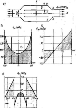 Вернемся к рассмотрению эпюры напряженной полосы, ослабленной отверстием (рис. 2.46, в). Напряженное состояние в сечении А — А близко к одноосному. Допустим, что около отверстия