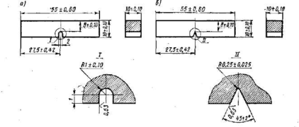 Рис. 3.4. Образцы для испытаний на ударный изгиб; а — тупой надрез; б — острый надрез