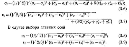 При неодноосном напряженном состоянии в общем случае в каждой точке тела имеются напряжения σх, σу, σz, τху, τуг, τгх и деформации εх, εу εг, γху, γуг, γгх. Важными характеристиками напряженного и деформированного состояния являются, σi —-интенсивность напряжений, εi—интенсивность деформаций: