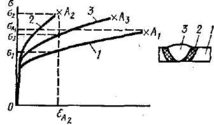 вдоль шва и все прослойки испытывают одинаковые деформации. Деформационная способность соединения и, как показано ниже, его несущая способность ограничены пластичностью металла наименее пластичной прослойки. На рис. 3.13 показаны диаграммы зависимости напряжения от деформации в различных зонах сварного соединения. Точки А1 А2 и А3 соответствуют разрушению образца. Разрушение наступит при ε= εа2. При этом напряжения σi в основном металле, σ3 в шве и σ2 в твердой прослойке будут сильно различаться. Продольная растягивающая сила в основном воспринимается участком основного металла, так как его площадьнамного превосходит и площадь поперечного сечения шва, и площадь твердой прослойки. И хотя уровень напряжений σ2 в твердой прослойке будет велик, средние напряжения будут близки к σ1 что существенно ниже разрушающих напряжений в точке А1. Это означает, что прочность сварного соединения с твердой прослойкой, нагруженного вдоль шва, окажется ниже, чем прочность такого же элемента из основного металла, так как разрушение в последнем случае произойдет при напряжениях, близких к σ1 < σа, Отрицательное влияние твердой прослойки сказывается сильнее, если по длине соединения встречаются резкие изменения сечения шва, вызывающие концентрацию напряжений, или еще хуже — поперечные трещины или другие дефекты в твердой прослойке.
