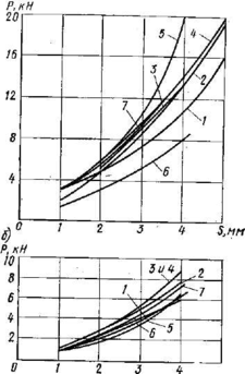 Рис. 3.20. Разрушающие усилия Р на срез (а) и на отрыв (б) для сварных точечных соединений в зависимости от толщины металла s: