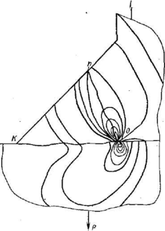расчетом по теории течения. Видно, что они сгущаются вблизи максимально нагруженного сечения Он. Если металл находится в вязком состоянии, то последующее разрушение происходит в основном по этой же плоскости On. По мере снижения вязкости металла характерно отклонение плоскости последующего разрушения в сторону, обеспечивающую преобладание нормального отрыва, т. е. к линии Ok, несмотря на то что эта плоскость менее нагружена.
