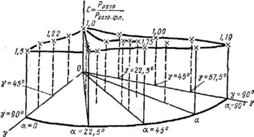 Рис. 3.24. Результаты испытаний сварных соединений с угловыми швами в зависимости от направления нагрузки, определяемого углами а и у: