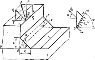 Рассмотрим вначале прочность и пластичность угловых швов, выполненных из пластичных металлов, по свойствам близким основному металлу. Как показывают экспериментальные данные, в этом случае наибольшие пластические деформации при нагрузке и последующее начальное разрушение возникают вблизи такого сечения On (рис. 3.22), в котором интенсивность напряжений σi. вычисленная по средним напряжениям, является максимальной. Угол, образованный этой плоскостью с осью Оу, обозначим φ. Для определения положения этой плоскости вычислим напряжения σi. Сила Р в общем случае может быть направлена произвольно. Разложим силу Р на две составляющие: Рх, направленную вдоль углового шва, и Рα, расположенную в плоскости yz. Сила Рх вызывает касательные напряжения τх вдоль шва. Определим длину отрезка ОА при равных катетах К шва: