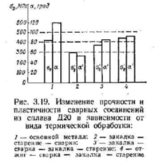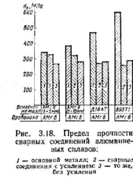 В алюминиевых сплавах, которые в исходном состоянии термически упрочнены, соединения после сварки существенно уступают по прочности основному металлу. Термической обработкой и старением удается заметно повысить прочность сварных соединений и приблизиться к уровню прочности основного металла (рис. 3.19). После полной термической обработки сплава Д20 прочность сварного соединения составляет 90—95 % от прочности основного металла. В соединениях из разнородных сплавов прочность зависит от менее прочного сплава и присадочного металла.