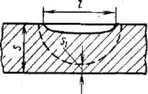 Схема испытания на рис. 3.35, д может быть использована для определения свойств металла стыкового шва в присутствии концентратора типа непровара (рис. 3.35, в). При непроваре более 30—35 % от толщины металла ослабление / можно не создавать. В образцах с непроваром из низкоуглеродистых и низколегированных сталей, как показывают экспериментальные исследования, величина есрр может быть приближенно вычислена по