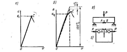 При испытании натружением силой Р образцов крупных размеров их разрушение наступает внезапно на линейном участке диаграммы (рис. 3.38, а) и определение K1c и G1c как раз соответствует моменту максимальных средних напряжений ос. Перемещение v регистрируют напротив надреза с трещиной на базе АВ (рис. 3.38, в, г). Если при определении K1c и G1c используют образцы меньших размеров, то либо условия плоской деформации выдерживаются не полностью, либо область пластических деформаций у конца трещины становится большой и диаграмма перестает быть линейной (рис. 3.38, б). В этих случаях энергетические затраты на разрушение крупного образца и образца ограниченных размеров до состояния, соответствующего точке С, могут не совпадать. Поэтому применяют условную процедуру обработки результатов испытаний, проводя линию ON на 5 % ниже линии упругого участка, и для определения K1c и Gjc берут напряжение oQ. Достоверность найденной величины проверяют по дополнительным признакам, изложенным в [20]. Величины К1c и G1c носят название критериев Ирвина,