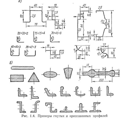 Прессованные профили изготовляют из алюминиевых сплавов. Примеры гнутых (а) и прессованных (б) профилей приведены на рис. 1.4.