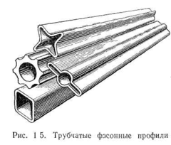 Трубчатые профили различных очертаний постоянного и переменного поперечного сечения изготовляют сваркой, горячей прокаткой, прессованием, горячим и холодным волочением и раздувкой. Помимо круглого профиля, наиболее распространенного в промышленности, изготовляют также фасонные трубы (рис. 1.5).