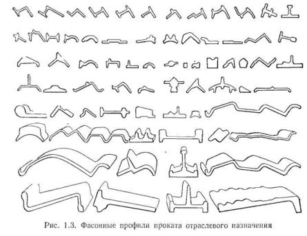 Фасонные профили отраслевого назначения применяют в различных областях народного хозяйства: для изготовления рельсов железнодорожного транспорта, тавровых и зетовых элементов строительных конструкций и т. д. Сортамент фасонных прокатных профилей весьма разнообразен (рис. 1.3). Он включает периодические, штампованные, гнутые, прессованные и трубчатые профили.