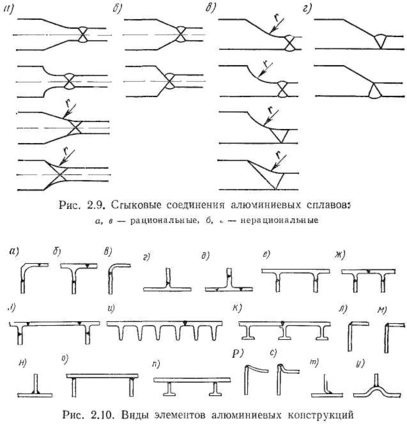 При изготовлении конструкций из алюминиевых сплавов рекомендуется применять стыковые соединения, а также соединения, в которых сварные швы расположены в зонах пониженных рабочих напряжений. Целесообразны конструкции повышенной гибкости (деформируемости).