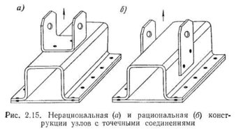 Точки в сварном соединении следует располагать таким образом, чтобы они воспринимали преимущественно усилия среза, а не отрыва. На рис. 2.15, а конструкция нерациональна — точки в ней работают на отрыв; на рис. 2.15, б—рациональна.