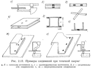 На рис. 2.12, ж показана конструкция, свариваемая изогнутым электродом, трудно выполнимая для сварки на точечной машине; па рис. 2.12, з изображен рациональный узел.