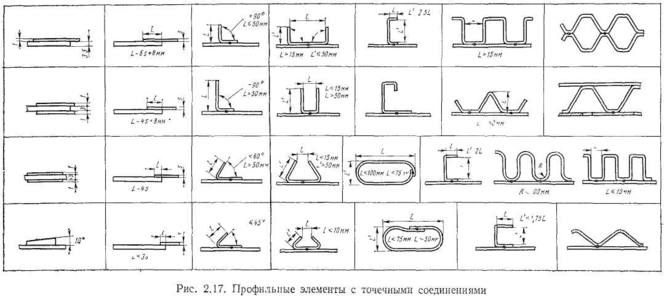 Часто в конструкциях парные точки являются связующими и рабочих напряжений не передают. Например, при формировании профилей элементов конструкций, которые воспринимают продольное усилие, точки служат для связи между отдельными частями. Соединения обшивок с каркасом также часто осуществляют точками. Указанные точки при статических нагрузках в большинстве случаев не оказывают существенного влияния на прочность. Примеры сварки профильных элементов точками приведены на рис. 2.17. В верхнем горизонтальном ряду даны точечные соединения, особенно удобные для сварки, во втором ряду — удобные, в третьем — не вполне удобные, в четвертом — трудные.
