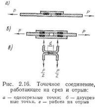 В соединениях, изображенных на рис. 2.16, а, б, расчет прочности точки производится на срез. Сварные точки могут быть односрезными (рис. 2.16, а) и двусрезными (рис. 2.16, б).