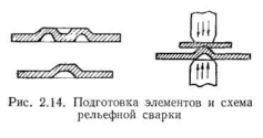 Для улучшения качества соединений точечную сварку иногда заменяют рельефной, при этом более точно фиксируется зона пропускания тока, уменьшается эффект шунтирования (рис. 2.14).