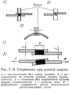 Соединения при шовной сварке. Шовная контактная сварка попускает возможность соединений элементов от весьма малых толщин до суммарной толщины 4 — 6 мм из сталей и цветных сплавов. Шовной сваркой, как правило, соединяют изделия при расположении роликов с обеих сторон соединяемых частей (рис. 2.18, а, б), но можно производить сварку и на подкладке при расположении роликов с одной стороны (рис. 2.18, в).