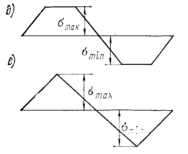 На рис. 4.2, а показана схема цикла симметричного нагружения |σmax|=|σmin|, на рис. 4.2,6 — знакопостоянного нагружения, на рис. 4.2, б — асимметричного знакопеременного нагружения |σmax|≠|σmin|, а на рис. 4.2,5——отнулевого. Пределы выносливости, определенные при симметричном цикле, обозначаются σ-1, при отнулевом — σ0, при произвольном — σr. Наибольшее значение имеют пределы выносливости при испытаниях на изгиб, несколько меньшее — при осевом нагружении