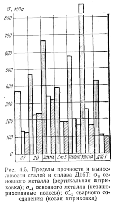Стали повышенной прочности наиболее эффективно используются в условиях статических и переменных нагрузок при r > 0. Если значения коэффициентов концентрации напряжений конструкции высоки и r →—1, то эффективность применения высокопрочных сталей резко понижается. Как показали исследования Института электросварки им. Е. О. Патона (табл. 4.3), в этом случае пределы выносливости для сталей с совершенно различными значениями пределов прочности почти не отличаются.