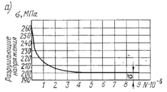 На рис. 4.1, б изображена диаграмма прочности металла в зависимости от числа циклов нагружения, построенная в полулогарифмических координатах.