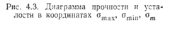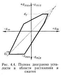 В целях изучения пределов выносливости в зависимости от характеристики циклов строится диаграмма выносливости. Наиболее часто пользуются построением диаграммы выносливости испытуемых образцов по методу Смита, представленной в схематизированной форме на рис. 4.3. По оси абсцисс от кладываются значения средних напряжений цикла σm = (σmax + σmin)/2, по оси ординат — напряжения σmax и σmin. Под углом