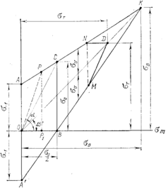 рямые пересекаются в точке К, которая характеризует цикл с бесконечно малой амплитудой. Условно принимают, что эта точка соответствует пределу прочности σв. Отрезок ОА выражает значение предела выносливости при симметричном цикле.