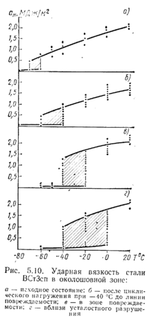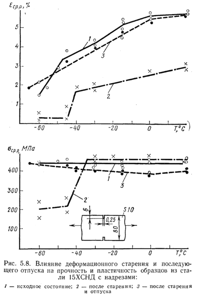 ср.р и средняя разрушающая деформация εср.р в ослабленном сечении. В первом случае на образцах из стали 15ХСНД при комнатной температуре производилась прокатка средней части вдоль образца для создания деформации около 1 % (у дна надреза возникала, естественно, существенно большая пластическая деформация). Затем образцы проходили старение при Т == 250° С в течение 3 ч. Старение вызывало дополнительное снижение средней пластической деформации примерно на 2 %, и (Тср.р при Т < —40 °С становилось ниже σ0,2. Последующий отпуск образцов при Т = 650 °С в течение 3 ч устранил вредное влияние старения. Во втором случае (рис. 5.9, а, б) по кромке образца из стали 22К с размерами, как на рис. 5.8, производилась наплавка валика. Сварочная пластическая деформация вызывала в корне надреза динамическое деформационное старение непосредственно в процессе сварки. Это привело к снижению σср.р во всем диапазоне температур и смещению Ткр2 примерно в область от —30 до —40 С. Последующий отпуск восстановил прочность и пластичность.