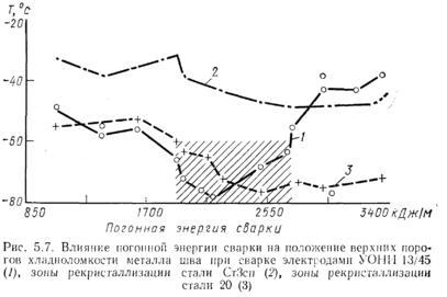 металла, его старение, отпуск и т. д. Одни и те же условия сварки неоднозначно влияют на порог хладноломкости шва и околошовных зон двух близких по составу сталей СтЗсп и 20 (рис. 5.7). (Штриховкой показан диапазон погонных энергий, благоприятный для металла шва.)