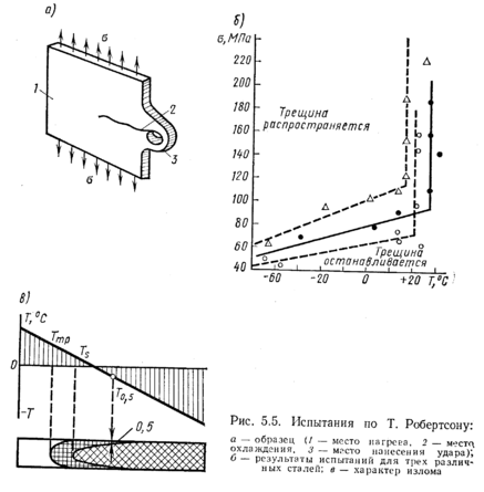 Существуют специальные методы для определения температур торможения движущихся трещин (при более низких температурах в ответственных конструкциях металл применять нельзя). В частности, метод Робертсона предусматривает испытание листовых образцов (рис. 5.5, а) относительно большой ширины (несколько сотен миллиметров) с натуральной толщиной металла 5. Перед разрушением образец с одной стороны подогревается, а с другой — охлаждается. Различные образцы испытывают при различных напряжениях. К образцу вначале прикладывают растягивающее напряжение а, а затем наносят удар для создания движущейся трещины. В некоторой зоне с известной температурой трещина останавливается. Простейшая обработка результатов испытания состоит в построении диаграмм, показанных на рис. 5.5, б. Точки соответствуют температуре остановки трещины. Ломаные линии делят область графика на две зоны. В левой верхней части рисунка находится область температур и уровней напряжений, где трещина распространяется. При более низких напряжениях или более