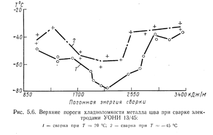 цов хрупкие участки. Свойства металла шва нередко различаются в зависимости от направления разрушения надрезанного образца — вдоль направления сварки или против. На рис. 5.6 приведен пример, когда оптимизация условий сварки шва (погонной энергии) проводилась по порогу хладноломкости. Естественно, что при изменении условий сварки одновременно изменялись химический состав шва и его кристаллизация. Лучшие результаты получились при погонной энергии сварки от 1800 до 2400 кДж/м.