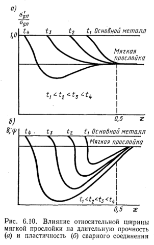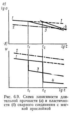 В случае непродолжительного времени до разрушения (кривая t1) прочность соединения оказывается равной прочности основного металла и при сравнительно широких прослойках (к = 0,3 — 0,4). Соединения с узкими прослойками равнопрочны основному металлу при большем времени до разрушения, но обнаруживают меньшую пластичность. При весьма большом времени до разрушения (t4) принципиально возможно разрушение, при котором прочность соединения окажется даже ниже прочности металла мягкой прослойки. Из рис. 6.10 видно, что уменьшение длительной прочности сопровождается снижением пластичности, служащим надежным признаком перехода сварного соединения к хрупкому разрушению.