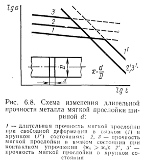 зависимости от относительной толщины мягкой прослойки χ (рис. 6.10) меняется отношение предела длительной прочности соединения σ’д.п к пределу длительной прочности основного металла σд.п, а также пластичность металла до разрушения δ или χ. Причем это изменение зависит от времени t до разрушения. Для сравнительно широкой прослойки (х > 0,5) контактного упрочнения недостаточно и прочность соединения соответствует прочности мягкой прослойки.