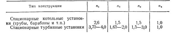 Расчет сварных соединений, работающих при высоких температурах, выполняется по допускаемым напряжениям, которые назначают в зависимости от допускаемых напряжений для основного металла, способа сварки, термической обработки и контроля качества сварных соединений. Допускаемые напряжения для основного металла принимают равными минимальному из следукщих соотношений: [σ] = σв/n1; [σ] = σт/n2; [σ] = σд.п/n3; [σ] = σп/n4, где σв, σт, σд.п и σп — гарантированные при температуре эксплуатации соответственно временное сопротивление, предел текучести, предел длительной прочности и предел ползучести (для весьма точных узлов). Коэффициенты запаса п1, п2, п3, п4 принимают в соответствии с табл. 6.2.