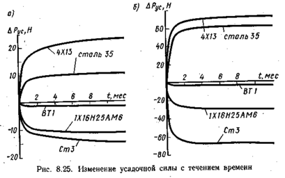 Характер изменения усадочной силы во времени при комнатной температуре, полученный на лабораторных образцах, показан на рис. 8.25, а. У титанового сплава ВТ1 и аустенитной стали 1Х16Н25АМ6, не испытывающих при сварке структурных превращений, а также у стали СтЗ, структурные превращения в которой происходят при высоких температурах, усадочная сила уменьшается из-за пластических деформаций металла в процессе релаксации напряжений. В сталях 4X13 и 35 усадочная сила растет вследствие уменьшения объема металла в зоне, где идет процесс 228