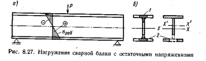 балки силой Р (рис. 8.27, а), имеющей зоны 1 и 2 (рис. 8.27, б) с остаточными растягивающими напряжениями, близкими к