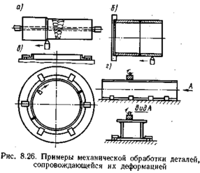) сварной шпангоут (рис. 8.26, в) после съема со стола утратит форму правильной окружности, а сварная балка (рис. 8.26, г) частично изогнется и не будет иметь плоской обработанной поверхности. В этих случаях требуется либо перекреплять детали перед финишными операциями (рис. 8.26, в, г), либо производить повторную обработку поверхностей с малыми объемами удаляемого металла (рис. 8.26, а, б).