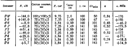 Определяем расчетные усилия, пользуясь методом разрезания фермы и отсечения отдельных узлов. Затем выбираем геометрические характеристики сечений гнутых профилей и подсчитываем напряжения в стержнях. Все эти данные приведены в табл. 20.2, значения коэффициентов ф взяты из табл. 19.1.