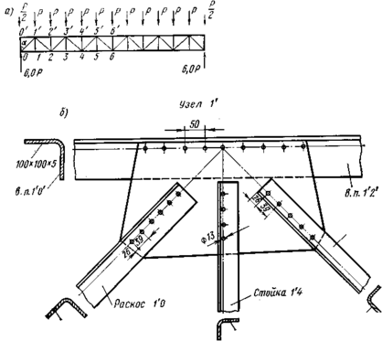 а — схема фермы; б — узел верхнего пояса